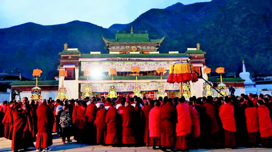 拉卜楞寺大經(jīng)堂門樓前陳列出九尊工藝精湛、用酥油塑成的佛像,眾僧列隊(duì)、朗誦經(jīng)文,僧俗群眾共同祈祝新的一年吉祥安康,慕名前來的國內(nèi)外游客,紛紛拍照留影,寺院熱鬧非凡,場面蔚為壯觀。