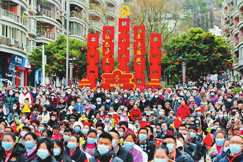 在瀘定橋廣場,四川省第二十五屆“文化列車·同心藝術(shù)團(tuán)”的百余名文藝工作者為在場群眾帶來一場精彩紛呈的文化演出。四川獨(dú)有的曲藝品種四川盤子《采花》,女子群舞《英姿》以躍動的肢體語言展現(xiàn)花木蘭從軍故事,可愛的熊貓木偶在演員操控下勾勒水墨畫……一個個節(jié)目不時贏得觀眾的叫好聲。
