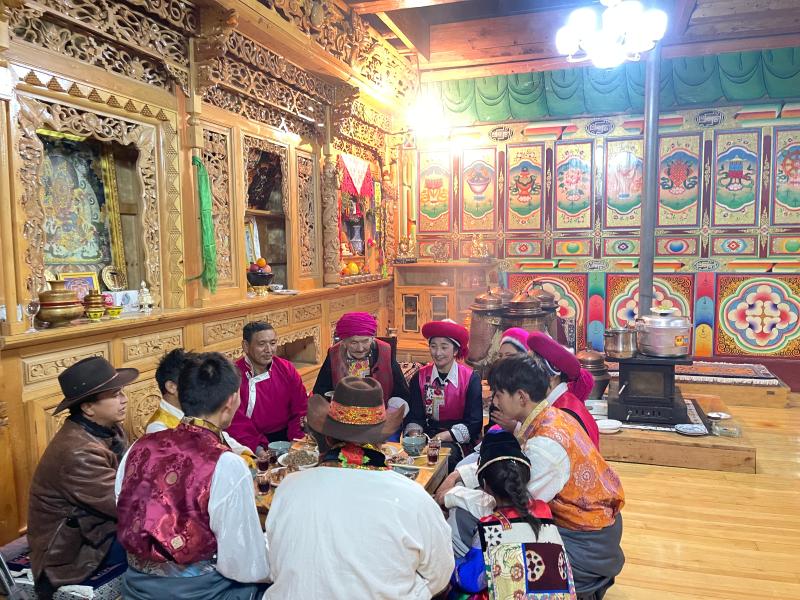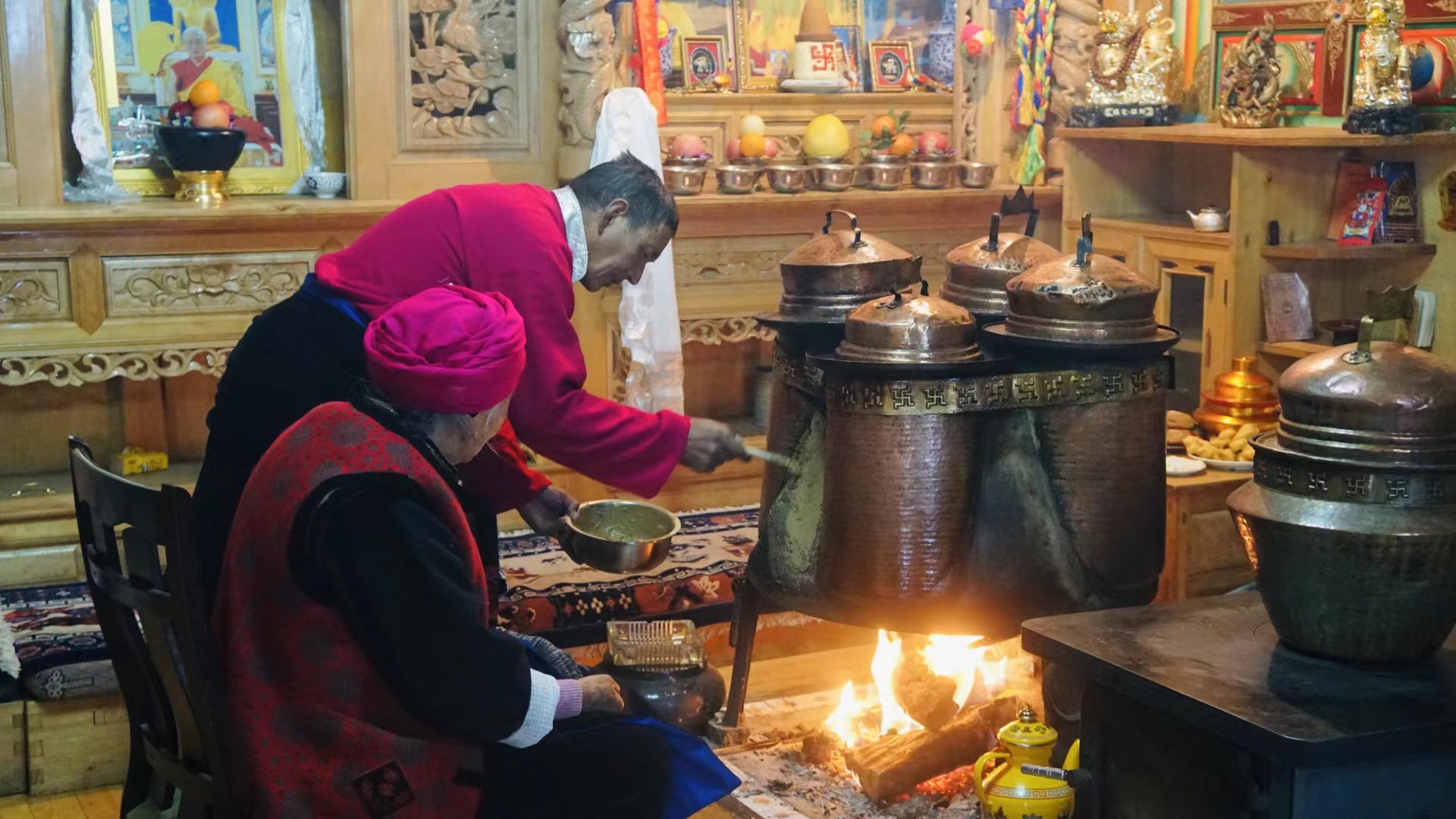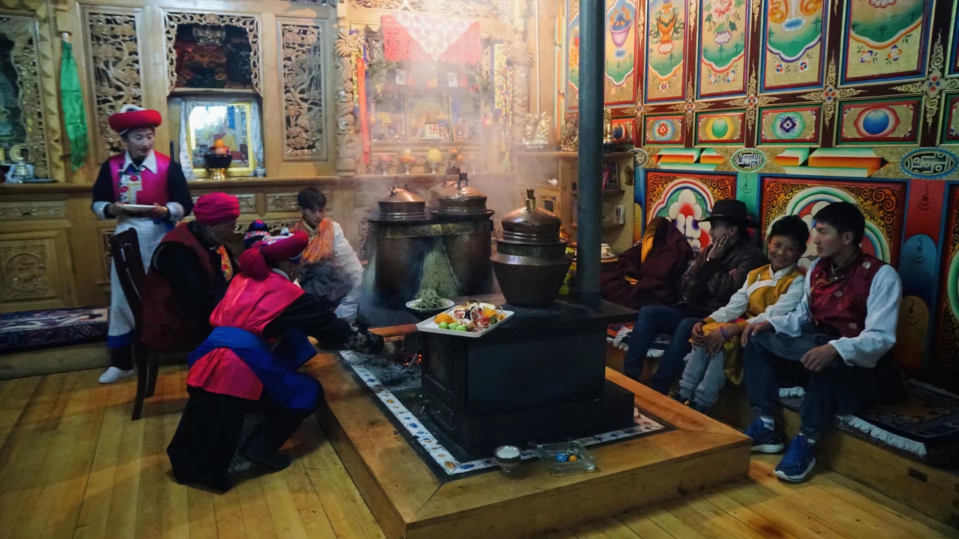 傍晚時分,“年夜飯”準(zhǔn)備完成,初稱站在火塘邊把剛和好的稀泥一層一層地刷到火塘上,“這是藏歷新年的添新土儀式(藏歷新年接福習(xí)俗),表示我們對來年日子風(fēng)調(diào)雨順、紅紅火火的美好期待。”初稱把這些傳統(tǒng)習(xí)俗認(rèn)真地教給家里的孩子們。