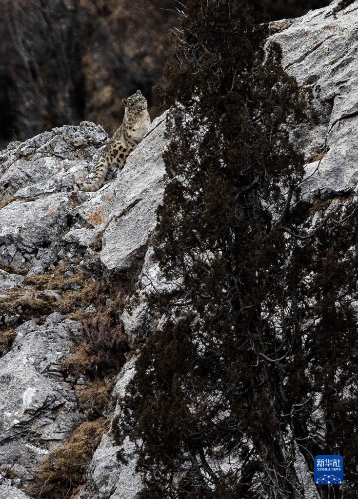 2月21日,在青海省玉樹藏族自治州雜多縣昂賽鄉(xiāng)境內(nèi)的昂賽大峽谷內(nèi),一只雪豹準備向上攀爬。新華社記者 費茂華 攝