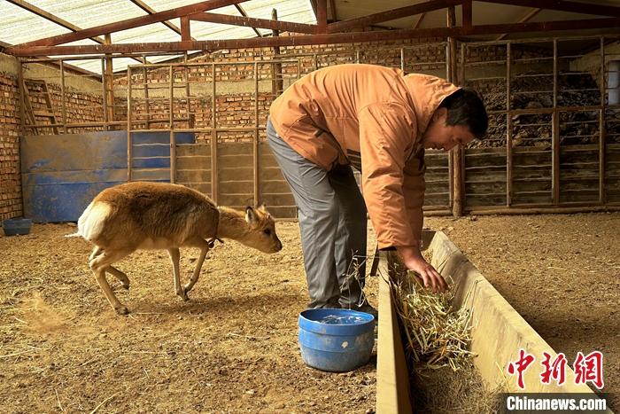 圖為周增本為小普氏原羚添草喂水。 中新社發(fā) 張得存 攝