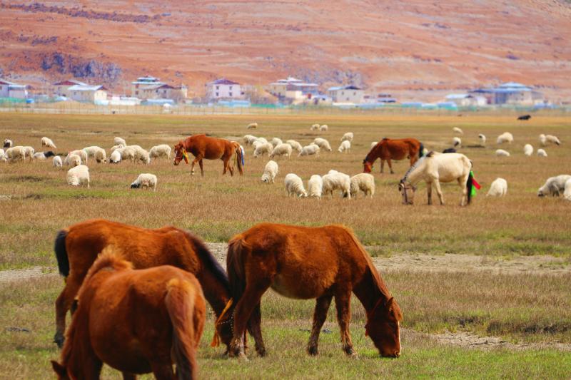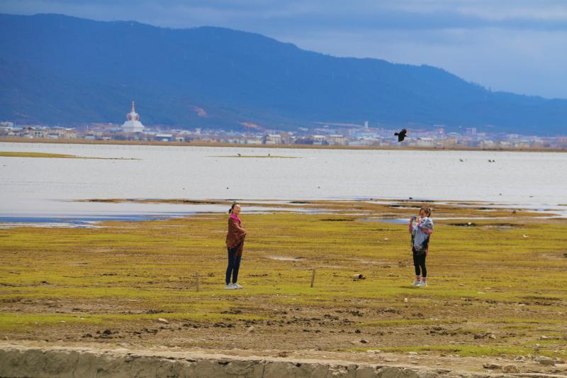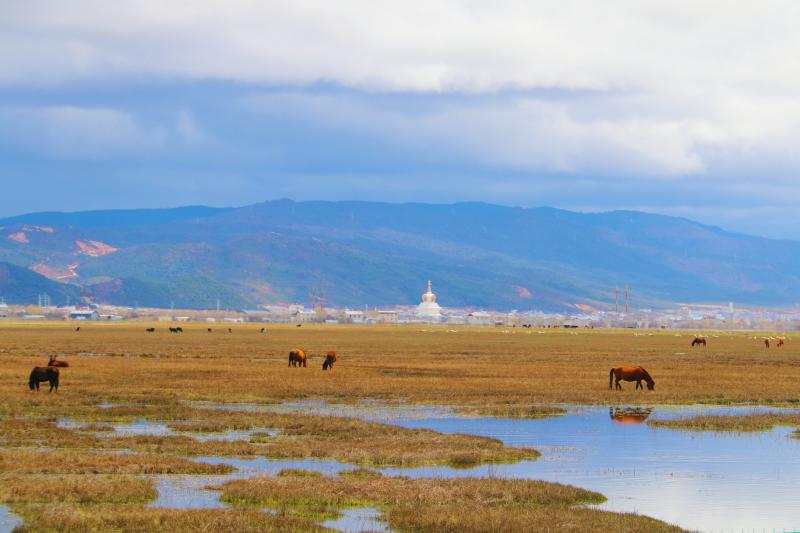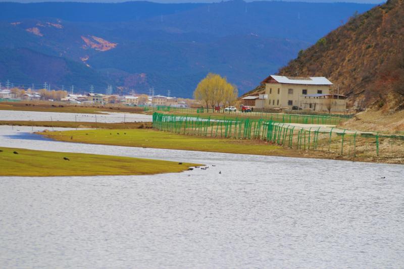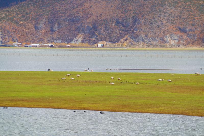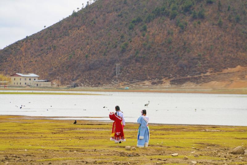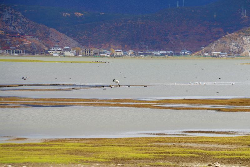 此時的納帕海,黑頸鶴還未離去,草色漸青,水草抽芽,鳥兒和牛羊悠閑覓食,這就是高原上的春天!