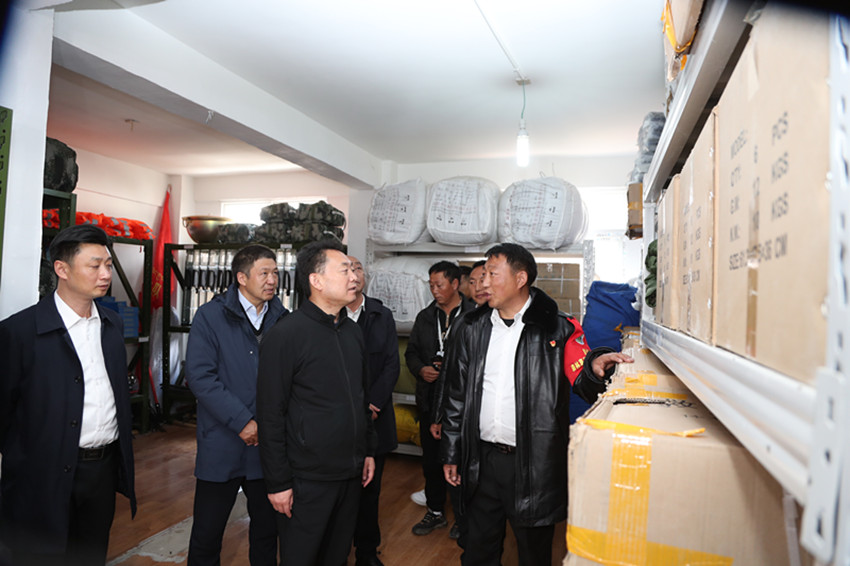 沈陽在理塘縣麥洼鄉(xiāng)察看應(yīng)急物資儲備情況。
