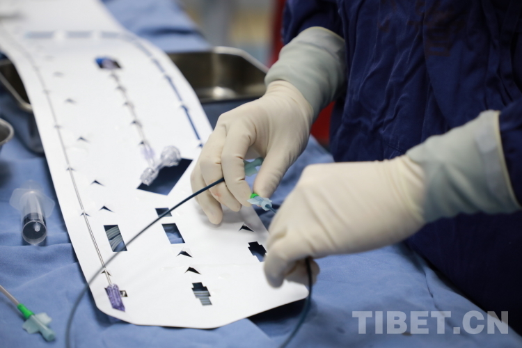 圖為北醫(yī)三院專家團隊在為來自青海省果洛藏族自治州的先心病患兒手術(shù)時使用的直徑僅4毫米的介入導管 攝影:劉莉