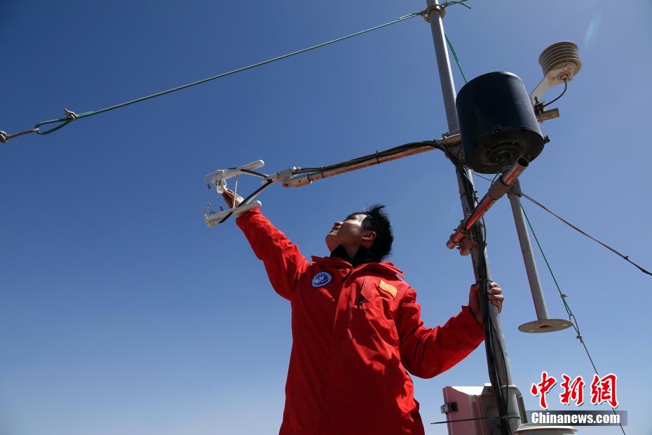圖為觀測(cè)站現(xiàn)場(chǎng),第二次青藏科考隊(duì)員、中科院空天院博士生陳舊對(duì)觀測(cè)設(shè)備進(jìn)行維護(hù)。 中新社記者 孫自法 攝