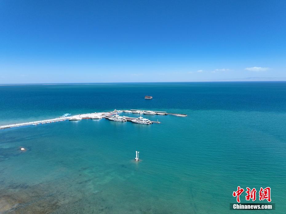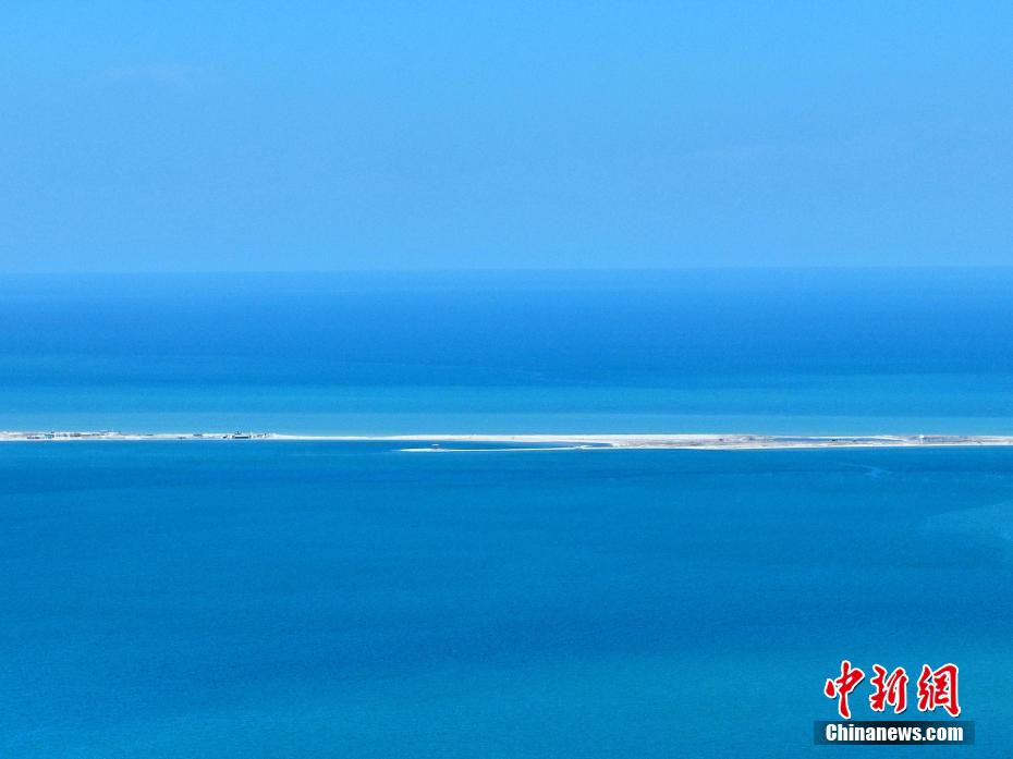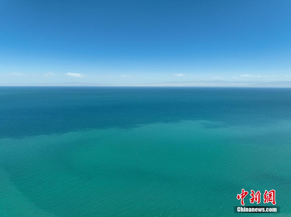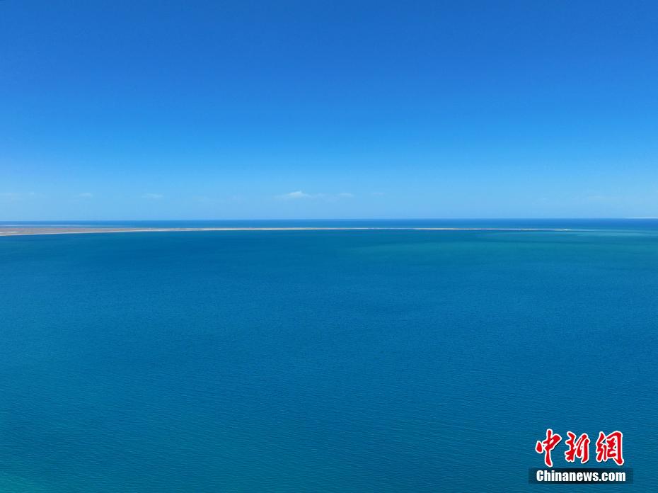 暮春時節(jié),素有“高原藍寶石”之稱的青海湖天高云淡、波光粼粼。遠處的山與碧藍的湖水交相輝映,宛如油畫,美不勝收。圖為航拍青海湖水天一色。