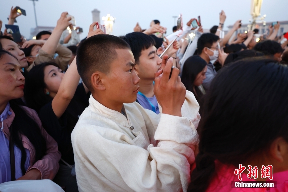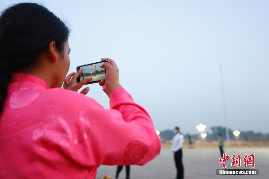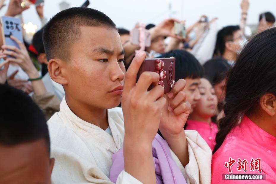 圖為藏族少年用手機(jī)記錄升旗儀式的瞬間。中新社記者 富田 攝