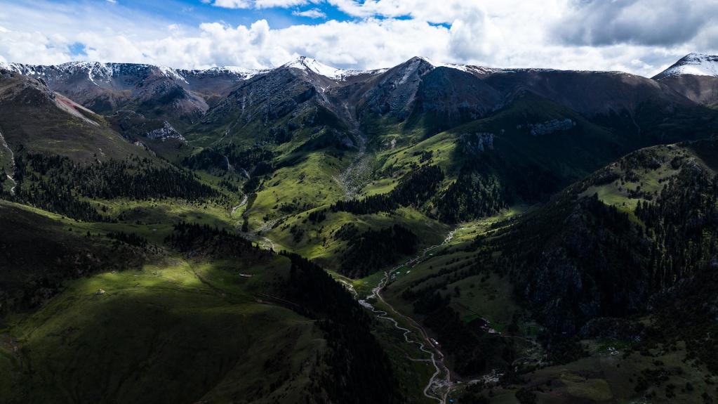 這是6月18日在青海省玉樹藏族自治州囊謙縣境內(nèi)拍攝的三江源地區(qū)風(fēng)光(無人機照片)。 新華社記者 張龍 攝