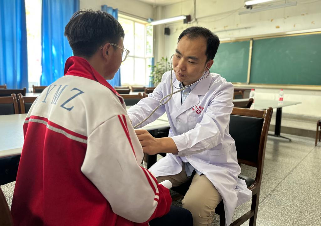 教學(xué)樓里,10名北京協(xié)和醫(yī)院的專家兩人一組,為200名學(xué)生進行骨科、眼科、兒科綜合檢查?!翱凑胺?。佩戴眼鏡后一定要按期復(fù)查。課間可以摘下眼鏡按摩一下,避免過度用眼。”北京協(xié)和醫(yī)院眼科專家李冰一邊拿著檢眼鏡細心檢查,一邊耐心地講解用眼知識。