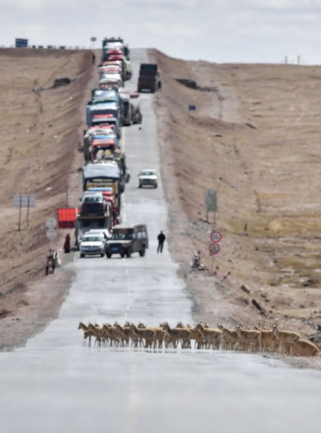 遷徙藏羚羊群經(jīng)過青藏公路可可西里五道梁路段。