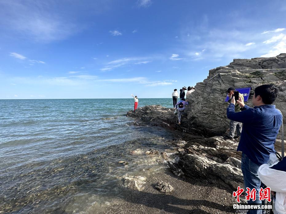 圖為游客在青海湖斷崖湟魚密集處留影。李雋 攝