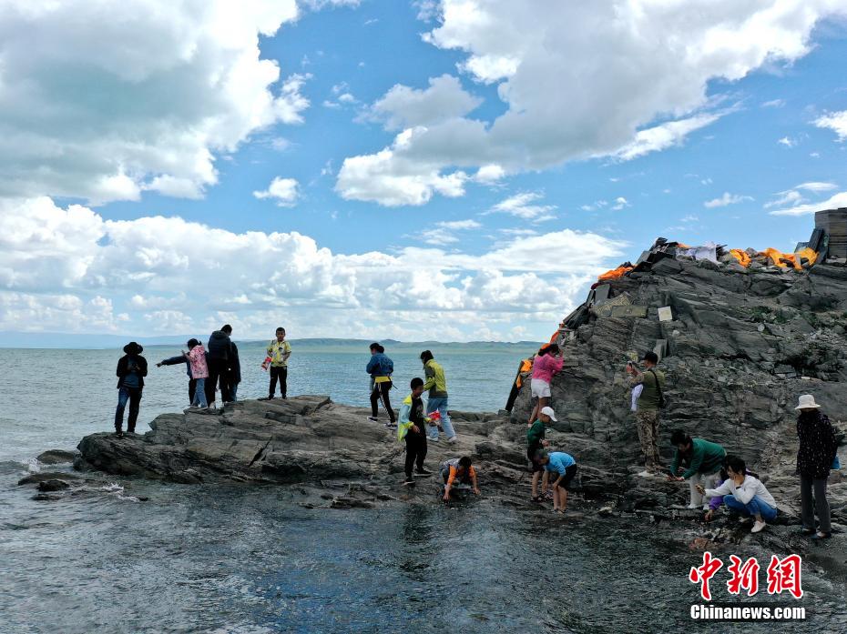 7月盛夏,在青海湖北岸的青海省海北藏族自治州境內(nèi)的青海湖斷崖,眾多省內(nèi)外游客聚集于此,一覽湟魚洄游季的生命奇景。青海湖斷崖視野開闊,可以遠(yuǎn)望青海湖的湛藍(lán)色湖面和周圍的雪山山脈。懸崖峭壁屬于天然形成的地質(zhì)地貌,是高于青海湖面十幾到二十米的小崖壁,當(dāng)?shù)孛癖姵T诖诉M(jìn)行祈禱和禱告。青海湖裸鯉俗稱“湟魚”,是青海湖中唯一的大型野生經(jīng)濟(jì)魚類,在青海湖“魚鳥共生”生態(tài)系統(tǒng)中發(fā)揮著獨(dú)特、核心作用。2004年青海湖裸鯉被列入《中國物種紅色名錄》瀕危物種名單中。每年7月前后,瀕危物種青海湖裸鯉進(jìn)入洄游季,密密麻麻的青海湖裸鯉集中在青海湖斷崖岸邊,頗為壯觀。