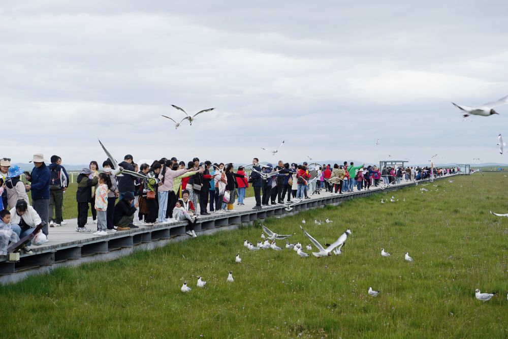 7月14日,游客在若爾蓋縣花湖景區(qū)內(nèi)游覽、拍照。新華社記者 邢拓 攝