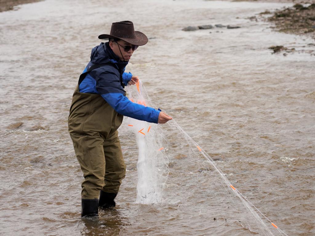 李偉在長江南源當曲河畔采集魚類樣本。新華社記者 陳杰 攝