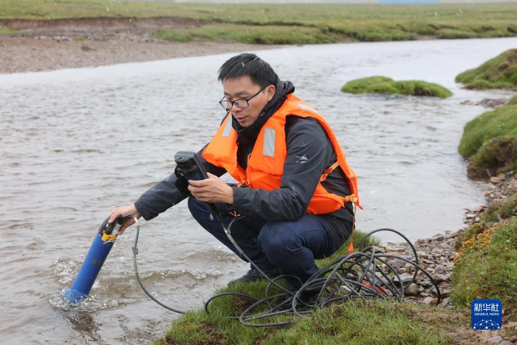 2023年江源綜合科學(xué)考察隊(duì)隊(duì)員劉敏在當(dāng)曲濕地檢測(cè)水質(zhì)(7月24日攝)。新華社記者 劉詩(shī)平 攝