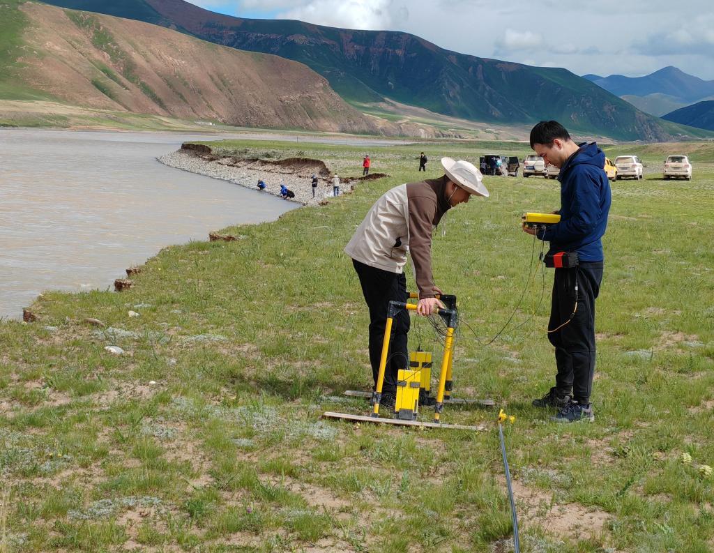 7月25日,范越(前左)和董士琦在長(zhǎng)江上游干流通天河畔開展地質(zhì)雷達(dá)探測(cè)。(受訪者供圖)