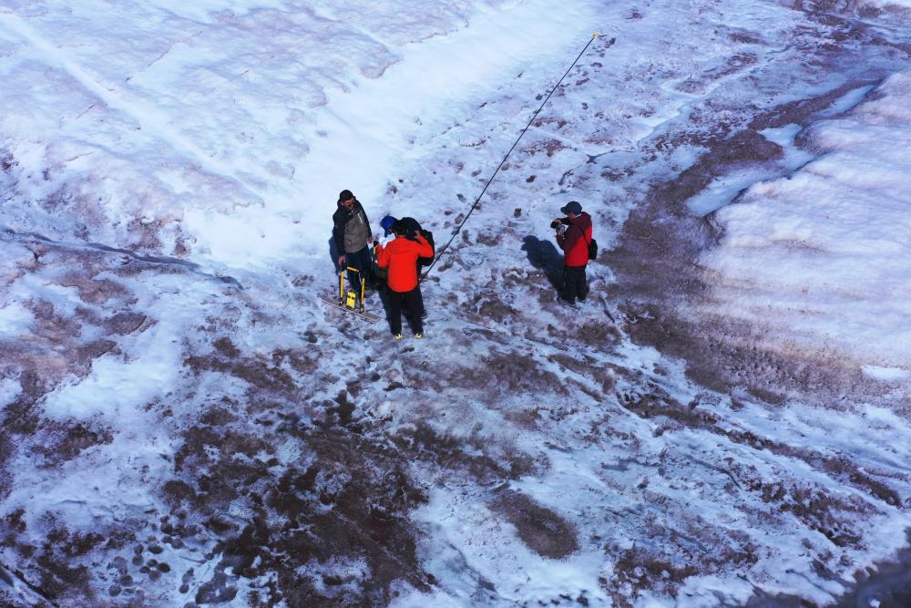 科考隊(duì)員在冰面上使用地質(zhì)雷達(dá)探測(cè)冬克瑪?shù)妆ê穸龋?月27日攝)。新華社記者 陳杰 攝