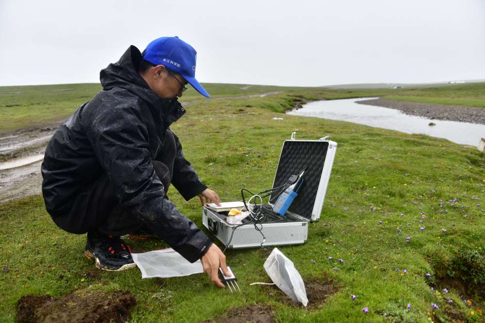 在查旦濕地,來自長(zhǎng)江科學(xué)院空間信息技術(shù)應(yīng)用研究所的科考隊(duì)員張雙印和隊(duì)友合作,用繩子圈出一個(gè)1平方米的正方形草地樣方,采集樣方內(nèi)的植被樣品;將圓柱形環(huán)刀釘入地下,采集土壤樣品。這些植被、土壤樣品將被送回實(shí)驗(yàn)室,統(tǒng)一分析碳含量。