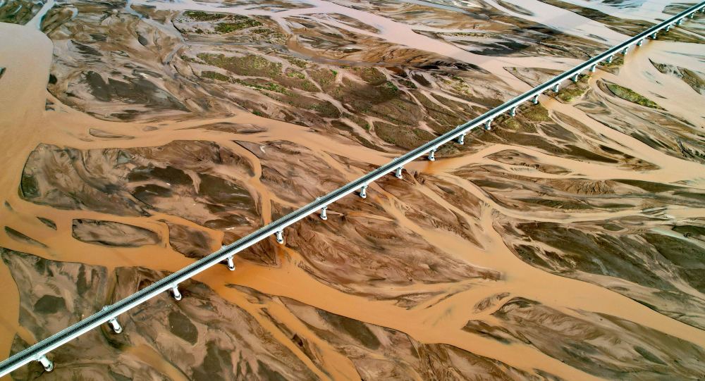 青藏鐵路通過辮狀河道的沱沱河(7月26日攝,無(wú)人機(jī)照片)。新華社記者 劉詩(shī)平 攝