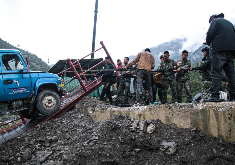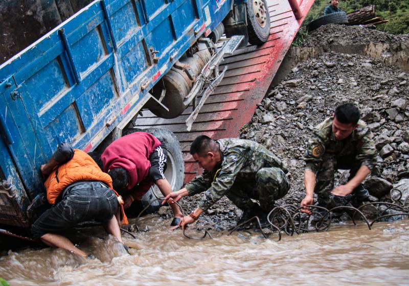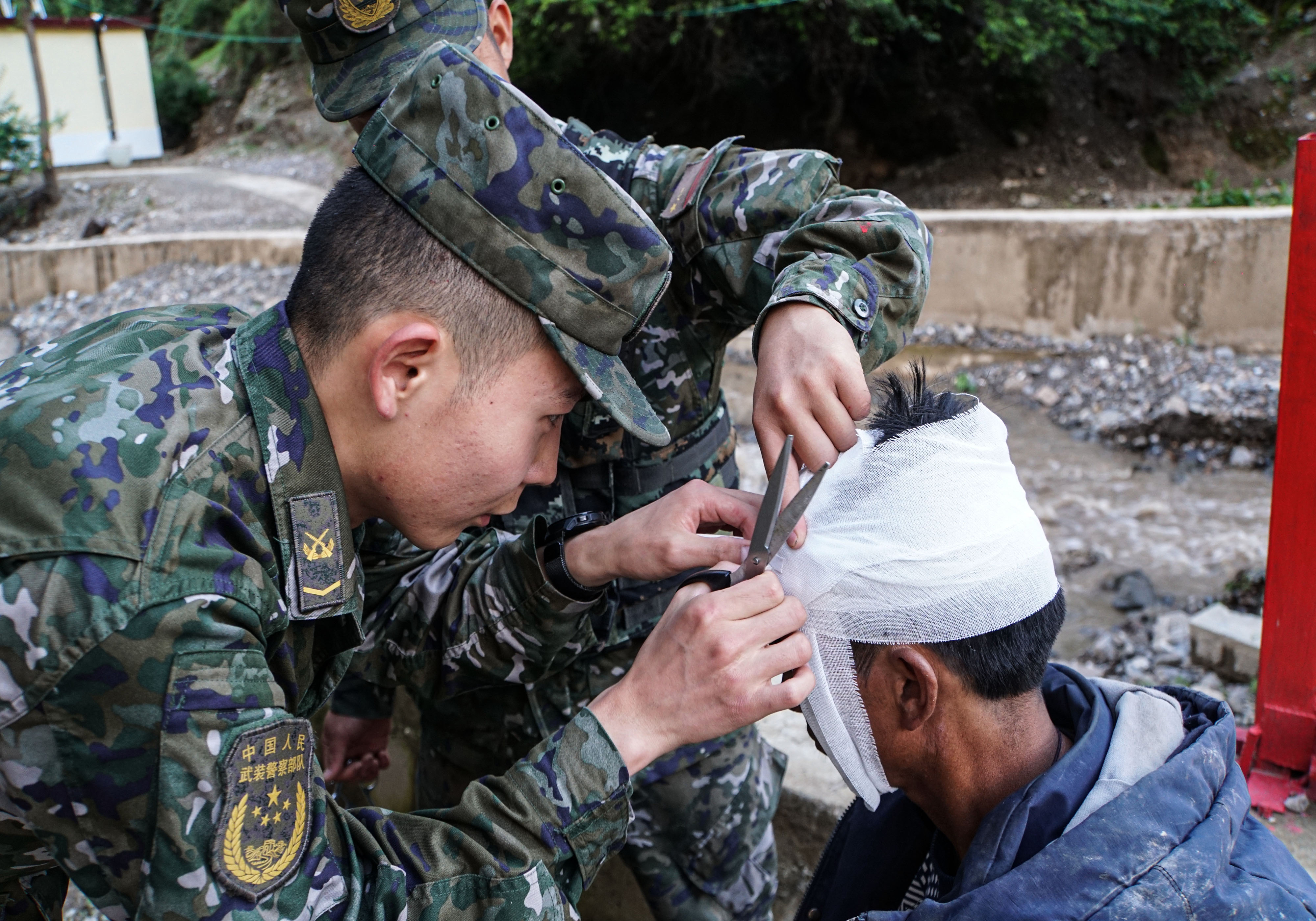 “同志,不要怕,我們是武警官兵,我們先給你處理傷口?!?甕云飛一邊安撫受傷群眾的情緒,一邊為他消毒止血、包扎傷口。后經(jīng)檢查,該群眾除了頭部有輕微皮外傷外,全身并無大礙。之后,中隊(duì)官兵又和當(dāng)?shù)厝罕娨黄鹜度胲囕v緊急救援,經(jīng)過幾個(gè)小時(shí)的努力,大家齊心協(xié)力將貨車拖至安全地帶。