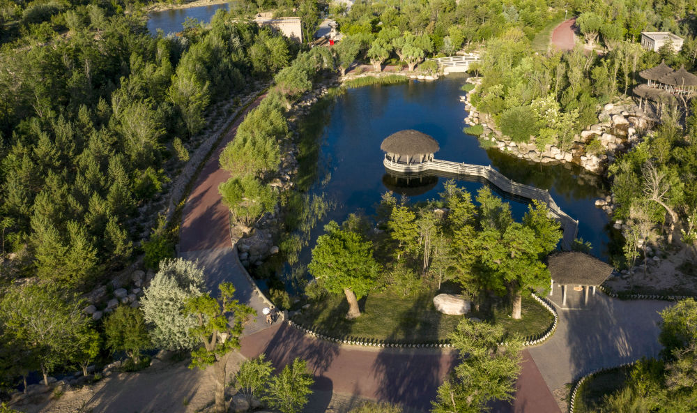 坐落在寧夏銀川市賀蘭山腳下的賀蘭山運動休閑公園(2021年5月27日攝,無人機(jī)照片)。這里曾是一片砂石采礦塌陷區(qū),當(dāng)?shù)赝ㄟ^植被景觀再造、水系建設(shè)、現(xiàn)代管網(wǎng)鋪建等手段,重新利用廢石、廢坑及各類廢棄建筑材料,把這里變成一座免費開放的主題公園。新華社記者 馮開華 攝