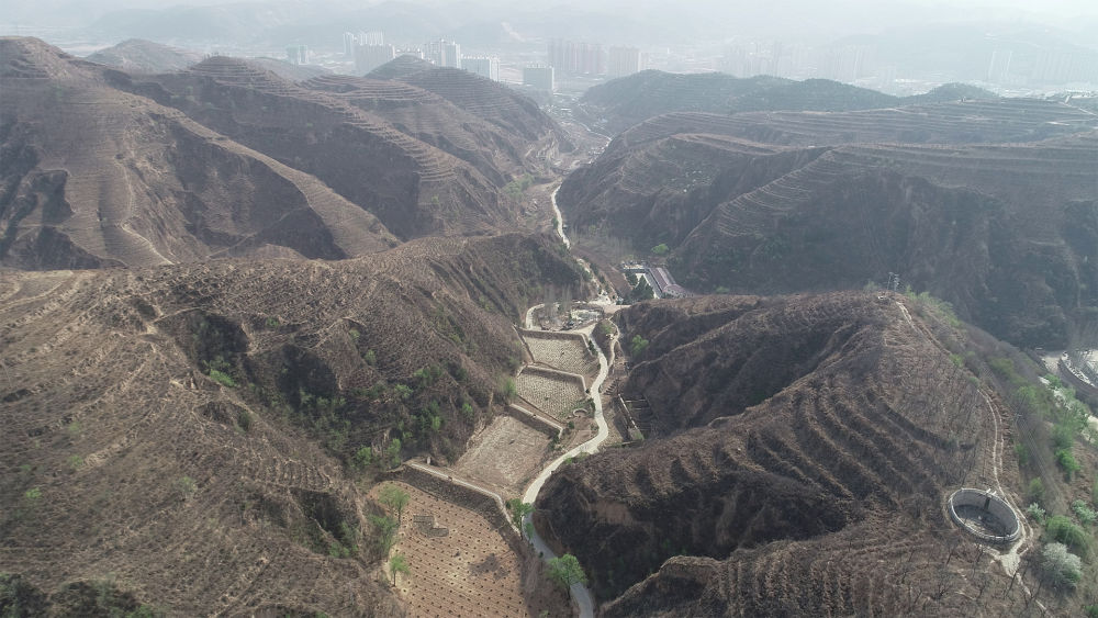 這是2019年4月18日無人機(jī)拍攝的陜西綏德水土保持科學(xué)試驗站淤地壩建設(shè)成果(視頻截圖)。新華社記者 張晟 攝