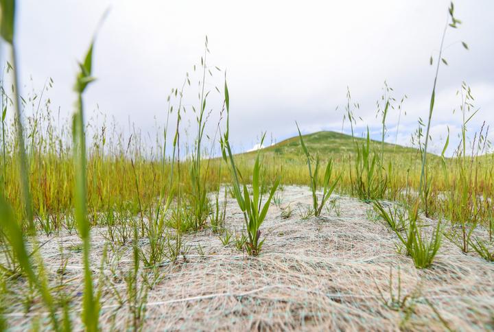 在若爾蓋縣唐克鎮(zhèn)嘎爾瑪村,這里的草原生態(tài)修復項目已完成近三個月。目之所及,蓋上“椰絲毯”的坡面,與遼闊的若爾蓋大草原融為一體。披堿草、老芒麥、高冰草和黑麥草從“椰絲毯”織成的小方格中破土而出,最高已近半米。