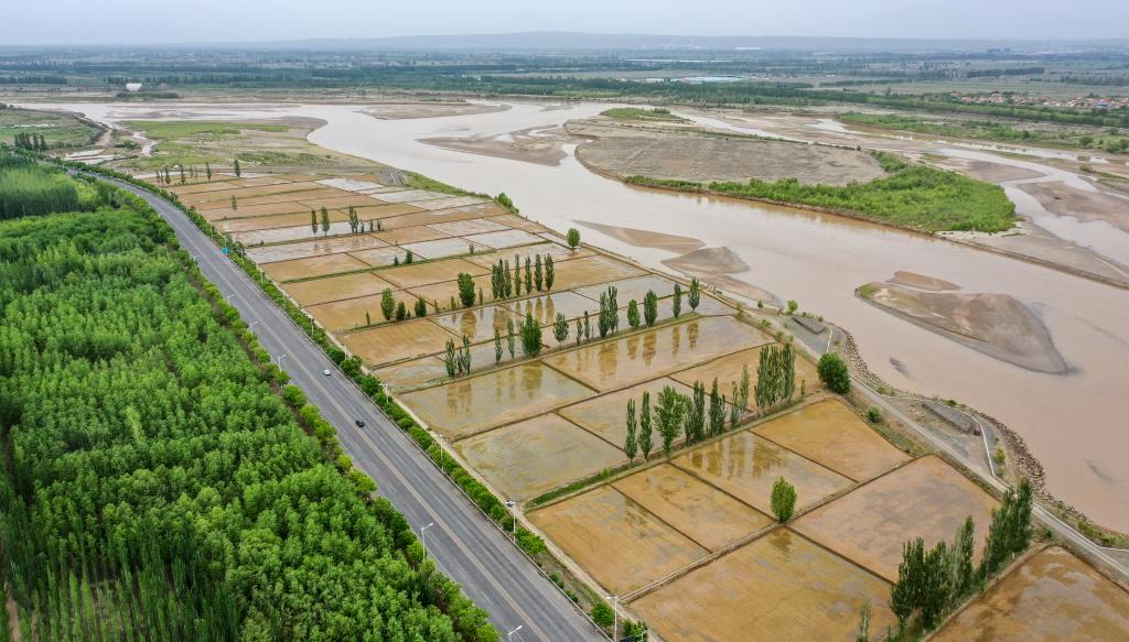 流經(jīng)寧夏青銅峽市境內(nèi)的黃河,滋潤著岸邊水稻和各種植被(無人機(jī)照片,5月25日攝)。新華社記者馮開華 攝
