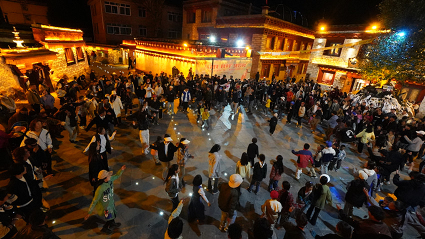 “加油、加油……”10月1日晚,在仁康小廣場上,遠(yuǎn)道而來的各地游客與理塘當(dāng)?shù)鼐用袢罕姸汲两诿袼谆顒?dòng)的歡樂節(jié)日氛圍中?,F(xiàn)場邀請(qǐng)游客進(jìn)行的三人拔河比賽,掀起了活動(dòng)高潮。“這里的氛圍讓我感到很舒服,也祝祖國母親生日快樂?!眮碜躁兾魑靼驳挠慰忘S家樂說。伴隨著各族群眾手拉手跳起的鍋莊舞,游客和群眾深切感受到民族大團(tuán)結(jié)的溫暖。