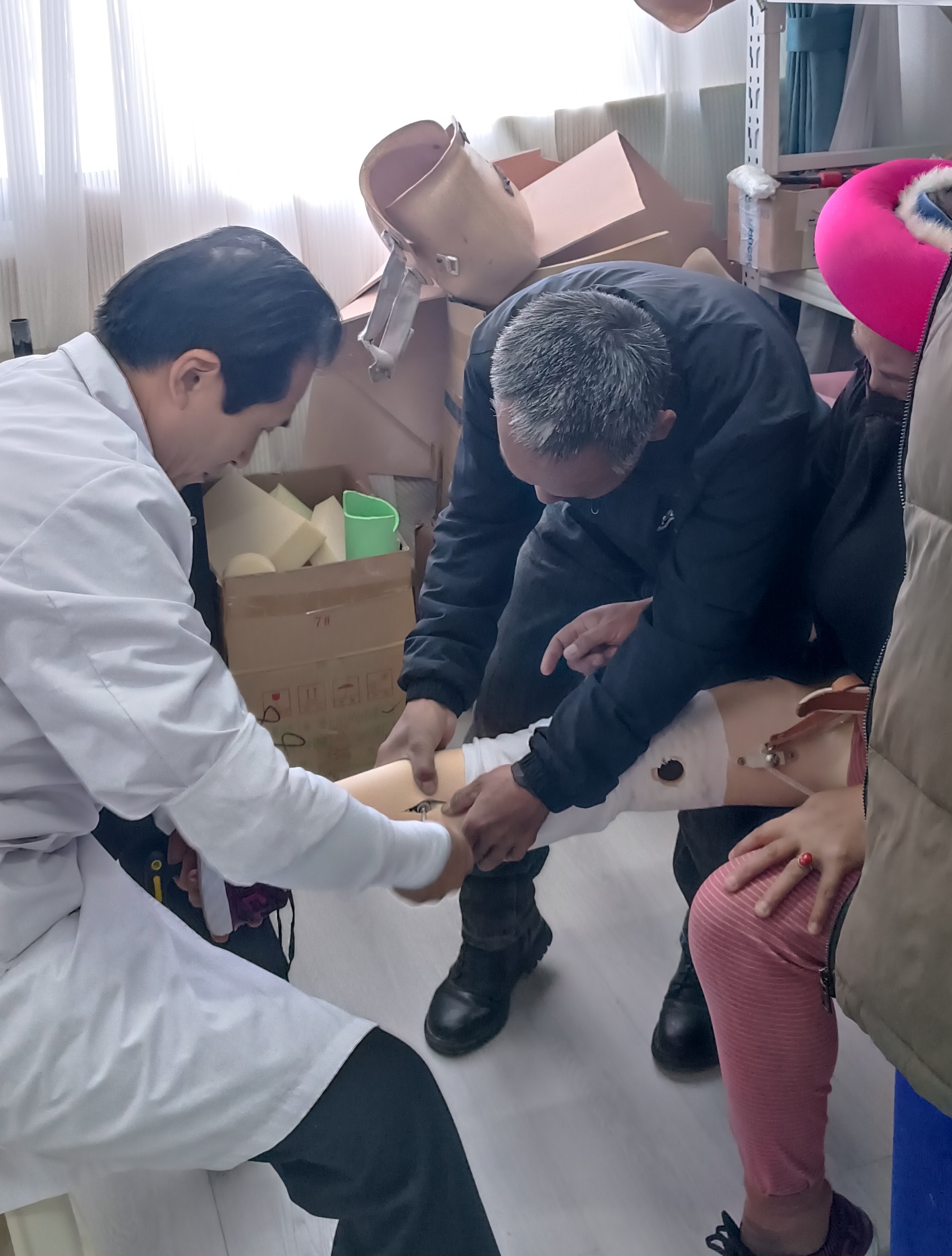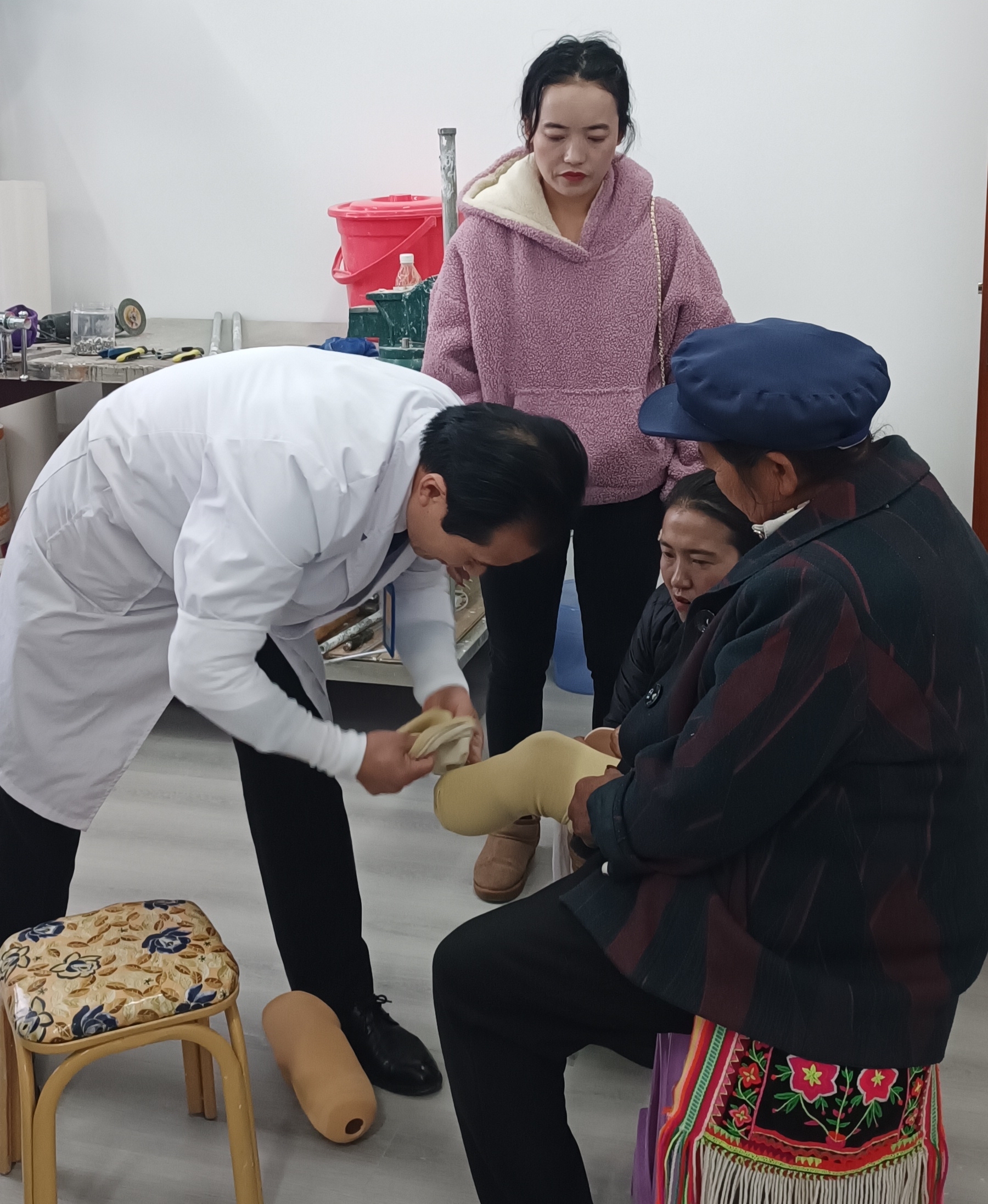 近日,在州康復中心,隨著30名肢體殘障群體的假肢適配成功,2023年省級殘疾人事業(yè)彩票公益金助聽器、假肢適配服務項目圓滿結(jié)束。據(jù)了解,該項目在今年還為我州300名聽力殘障群體免費適配助聽器。圖為醫(yī)生為肢體殘障人士適配假肢。