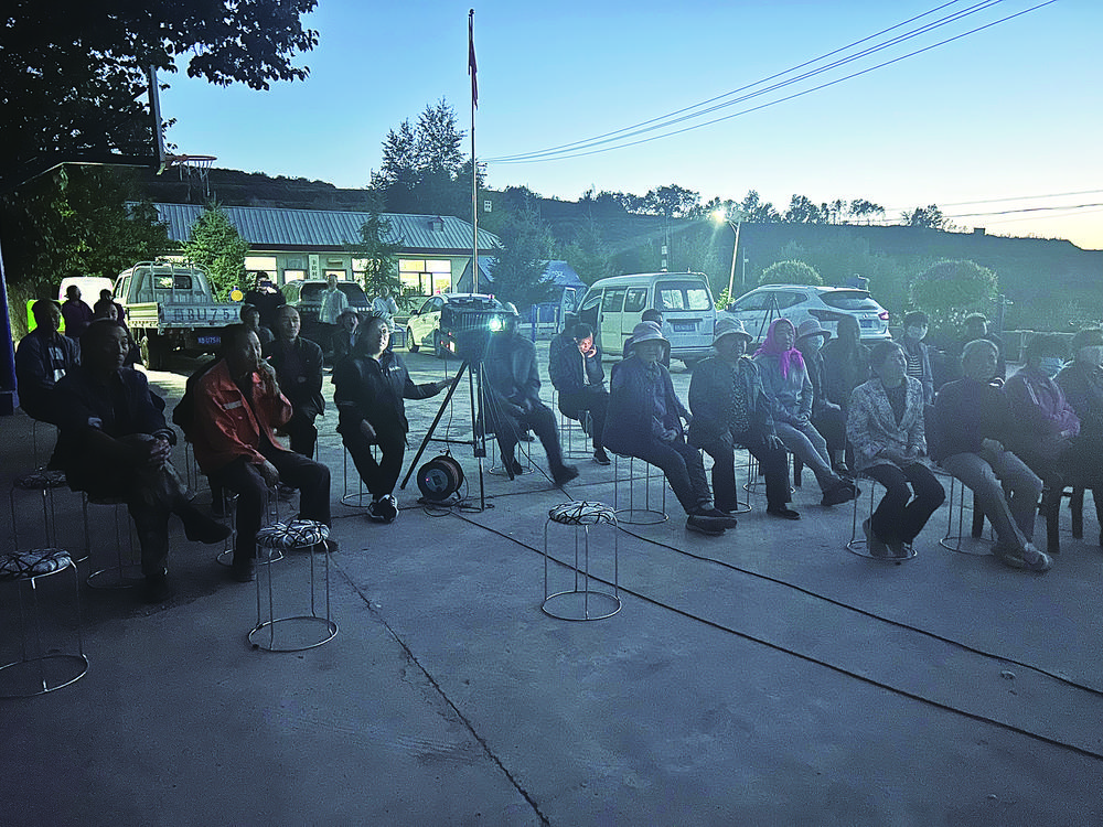 吳家洼村。光影下,村民們的目光齊齊聚集在正播放《長(zhǎng)安三萬(wàn)里》的熒幕上,黃得梅坐在設(shè)備旁和村民們一同觀看,時(shí)不時(shí)有幾個(gè)村民過來和她聊幾句。