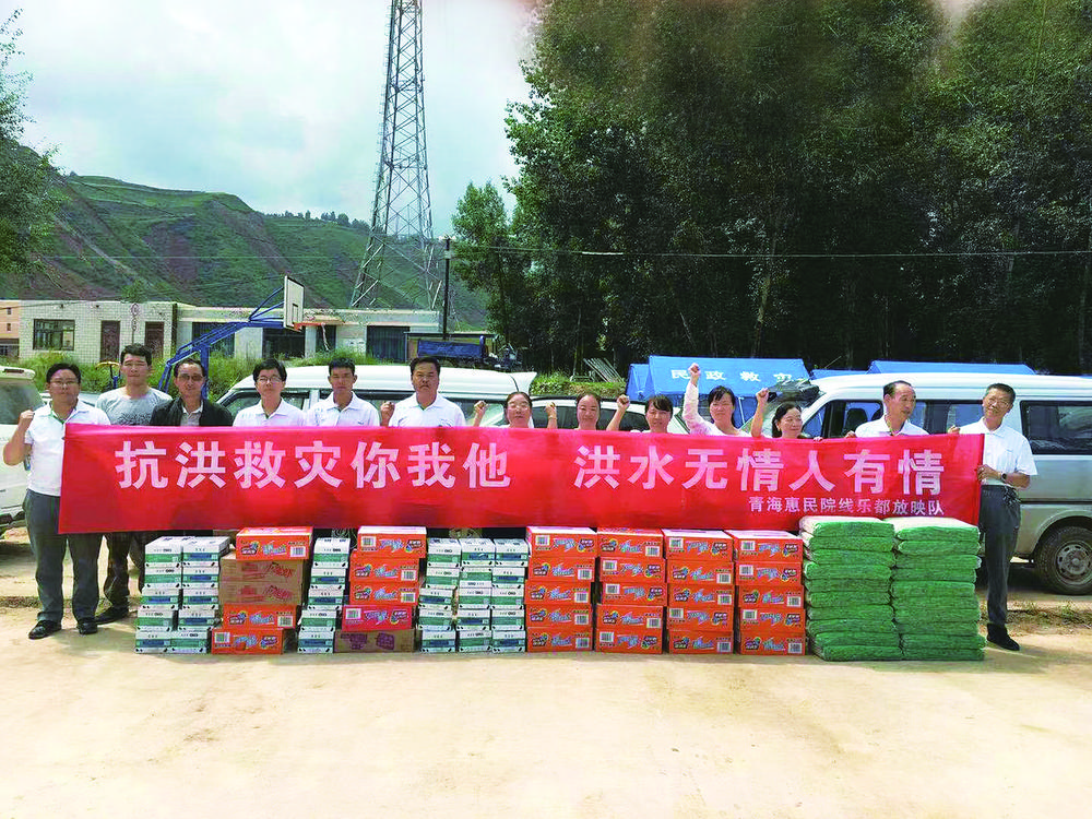 2022年,樂都區(qū)中壩藏族鄉(xiāng)發(fā)生洪災(zāi),黃得梅帶頭捐款,放映隊(duì)16名放映員買了一車方便面、牛奶、礦泉水和掛面送到了中壩。雖然洪水把很多路段都沖斷了,但是隊(duì)員們硬是用架子車把設(shè)備拉了上去,把溫暖和光影送給了受災(zāi)群眾。