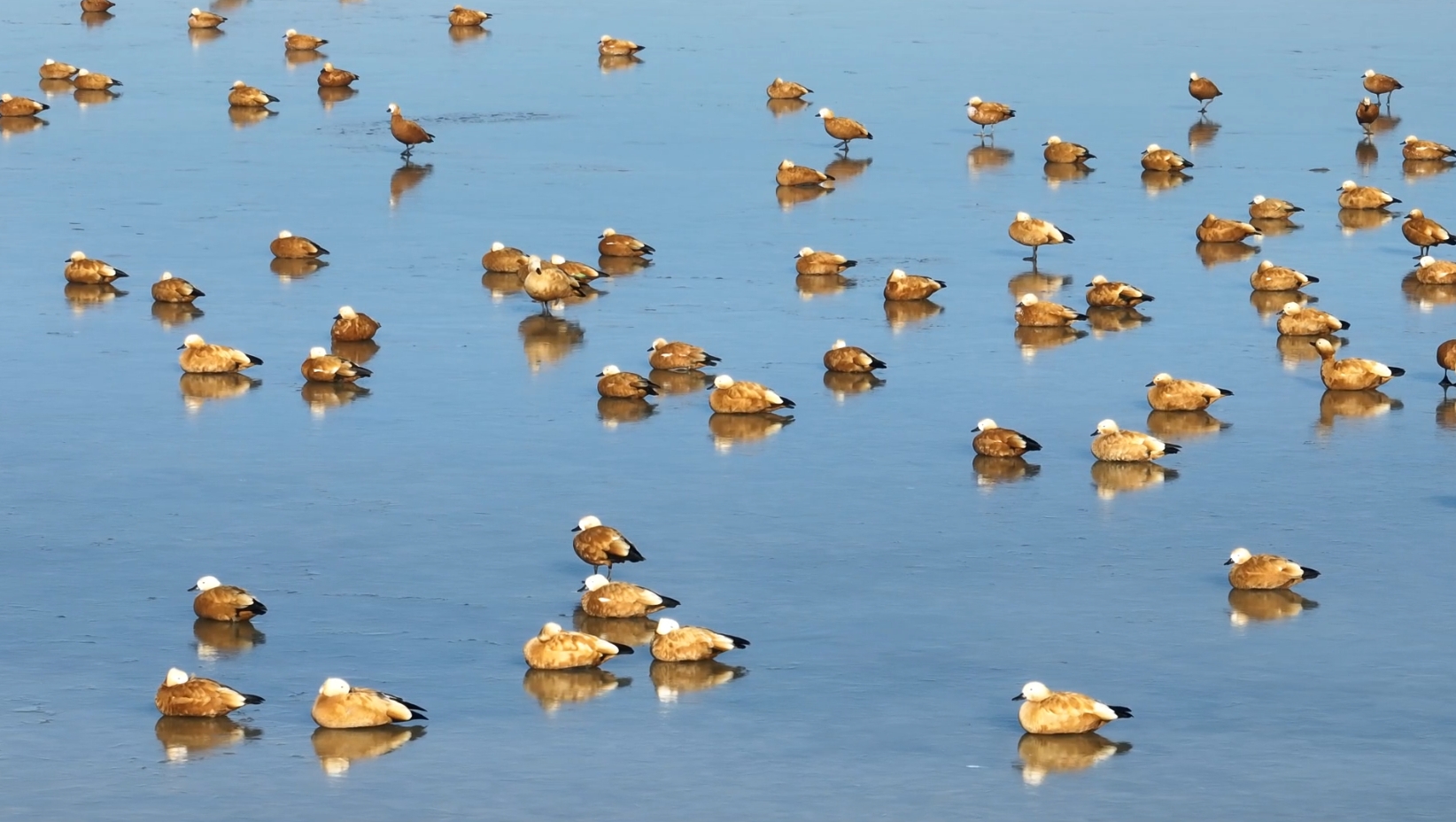 秋末冬初,昆侖山腳下的尕斯庫(kù)勒湖濕地迎來(lái)數(shù)千只赤麻鴨,它們?cè)诮Y(jié)了薄冰的湖面上或嬉戲,或休息,頗為愜意。