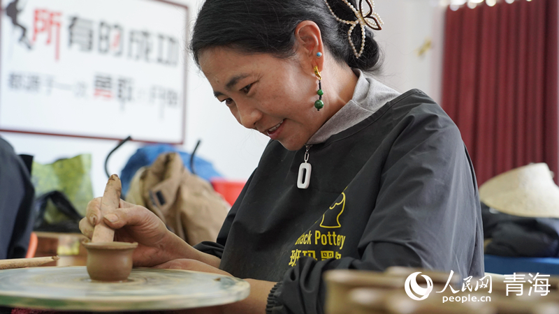 “在這兒既能在老師的指導(dǎo)下免費學(xué)到黑陶制作技藝,還能帶孩子?!鼻嗪J」宀刈遄灾沃莅喱斂h瑪可河鄉(xiāng)牧民金措正在打磨一件黑陶器皿,姑娘就坐在旁邊,時而玩泥巴,時而喝牛奶,一雙大眼睛好奇地觀察著四周。