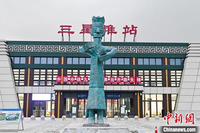 三星堆站位于德陽(yáng)廣漢市南興鎮(zhèn)與向陽(yáng)鎮(zhèn)交界處,距廣漢市區(qū)約5公里,距三星堆遺址約5公里,站場(chǎng)規(guī)模為2臺(tái)4線。車(chē)站廣場(chǎng)上,豎立著一尊青銅立人像,站房外立面將三星堆出土的青銅人面具抽象為車(chē)站整體造型,局部點(diǎn)綴回字紋雕花的仿古元素。同時(shí),裝飾裝修深化設(shè)計(jì)中將外立面檐口褐色調(diào)整為青銅色,彰顯了三星堆深遠(yuǎn)的人文背景?!败?chē)站站房以三星堆出土的青銅人面具造型為靈感?!敝需F九局成蘭站房項(xiàng)目部總工程師楊禮銘表示,施工過(guò)程中對(duì)鋁板內(nèi)部龍骨布置及鋁板分格進(jìn)行了數(shù)次優(yōu)化,順利完成站房裝飾裝修工程,投用后將成為當(dāng)?shù)匾坏貥?biāo)性建筑。