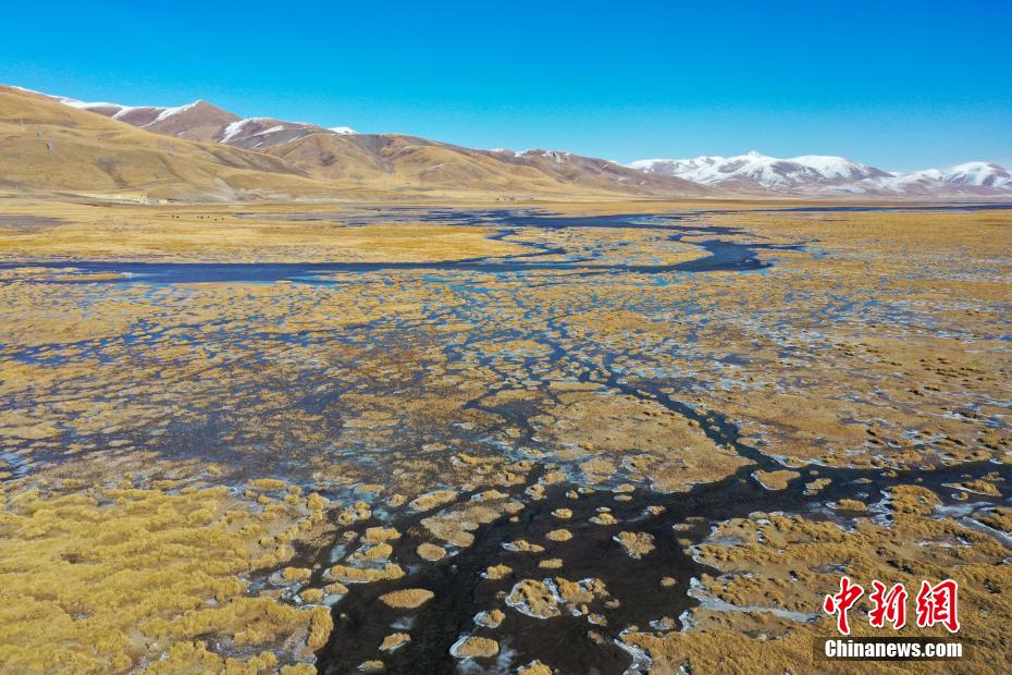 11月15日,航拍青海玉樹隆寶灘國際重要濕地冬日旖旎景色。降雪過后,位于青海省玉樹藏族自治州玉樹市境內的隆寶灘國際重要濕地連綿的山巒被白雪覆蓋,與金色的草地和蜿蜒的河流交相輝映,景色旖旎。