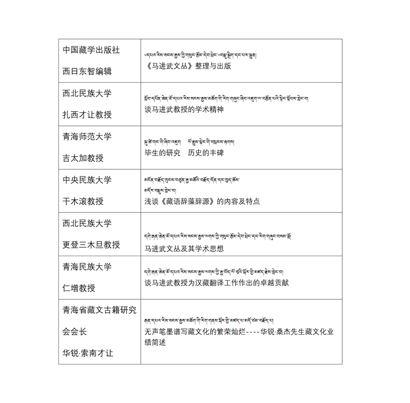 中國藏學(xué)研究中心原副總干事洛桑靈智多杰,青海省省志辦原總編、藏文古籍研究會名譽會長謝佐,西北民族大學(xué)科研處副處長英加布,甘肅省藏學(xué)研究學(xué)會副會長傅千吉,宗拉昌瓦公司總經(jīng)理扎西加等專家學(xué)者對《馬進武文叢》的學(xué)術(shù)水平和現(xiàn)實意義給予了高度評價,認為該系列叢書不僅體現(xiàn)并傳承了馬進武先生的學(xué)術(shù)思想,而且在推動新時代藏語文研究和藏漢翻譯事業(yè)發(fā)展、促進學(xué)術(shù)合作,推動民族語言學(xué)學(xué)科繁榮和進步等方面,具有高度的學(xué)術(shù)性和現(xiàn)實意義。西藏自治區(qū)藏醫(yī)院副院長銀巴研究員、四川民族出版社社長澤仁扎西、青海師范大學(xué)原副校長扎布教授、夏壩·嘉央克珠、甘肅華銳剛乃旦才讓、青海民族大學(xué)旦正教授、青海民族出版社副社長阿寧·扎西東主等對《馬進武文叢》的出版發(fā)行表示祝賀。