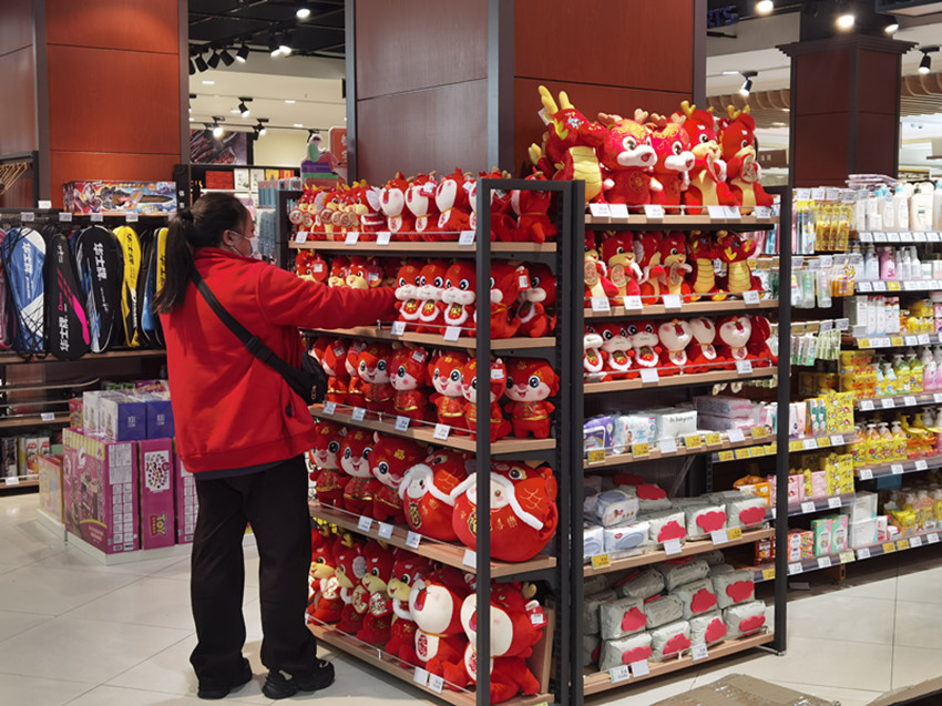 農貿市場一片火熱景象,而在各大超市里,各種龍年喜慶元素的年貨擺在貨架最顯眼的位置,增添了不少節(jié)日氛圍。顧客以年輕人居多,購物車里包裝精美的各類產品琳瑯滿目。