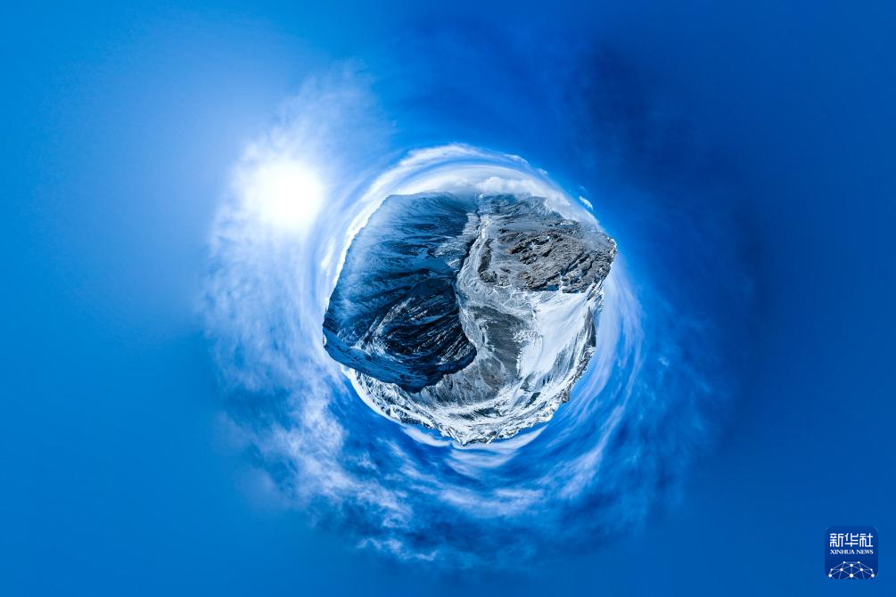 這是1月23日在青海省海北藏族自治州門(mén)源回族自治縣境內(nèi)拍攝的崗什卡雪峰(無(wú)人機(jī)全景照片)。新華社記者 張龍 攝
