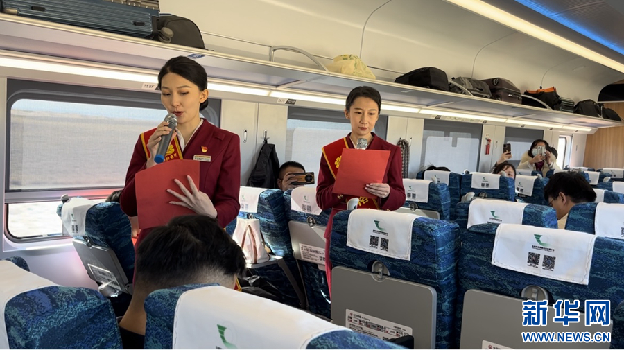 車廂內(nèi),喜慶的燈籠高高掛起,紅色的對聯(lián)、剪紙點綴其間,濃厚的新年氛圍撲面而來。過道里,乘務(wù)員們的律動操、音樂快板、詩朗誦等精彩節(jié)目令人目不暇接,乘客們紛紛拿起手機拍照錄像記錄。