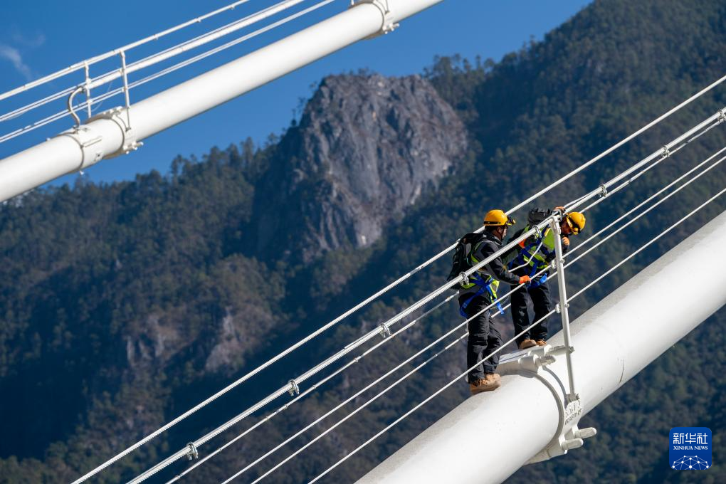 1月24日,工區(qū)班長楊應文(右)和工友劉榕基在主纜上巡檢。新華社記者 陳欣波 攝