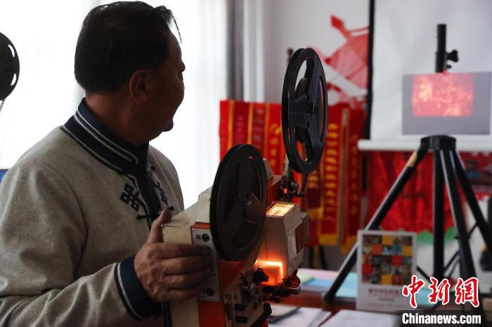 1月24日,電影放映員東德布在展示8.75毫米二型電影放映機。薛蒂 攝