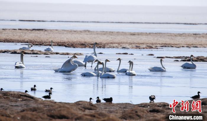3月13日,青海省海南藏族自治州共和縣境內(nèi)的青海湖泉灣濕地,大天鵝沐浴春日暖陽(yáng)。隨著天氣轉(zhuǎn)暖,大天鵝、斑頭雁、赤麻鴨等水鳥聚集在青海湖泉灣濕地,時(shí)而振翅飛翔、時(shí)而戲水覓食,鳴叫聲不絕,為仍處于冰封的青海湖增添生機(jī)和活力。