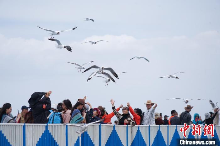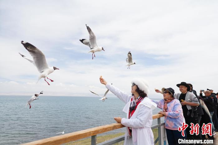 圖為游客在青海省海南藏族自治州共和縣青海湖二郎劍景區(qū)內(nèi)與棕頭鷗互動。 馬銘言 攝