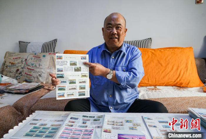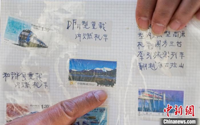 圖為徐超展示其收藏的中國郵政為紀念青藏鐵路全線建成通車,于2006年7月1日發(fā)行的一套紀念郵票中的其中一枚名為《列車駛過唐古拉山》的郵票。 馬銘言 攝