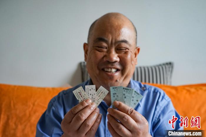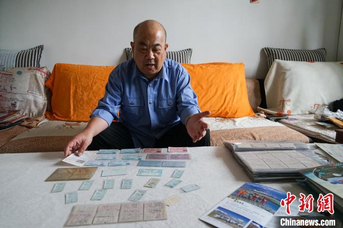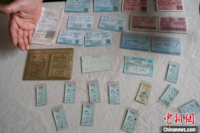 圖為徐超展示其收藏的不同年代的鐵路車票。 馬銘言 攝