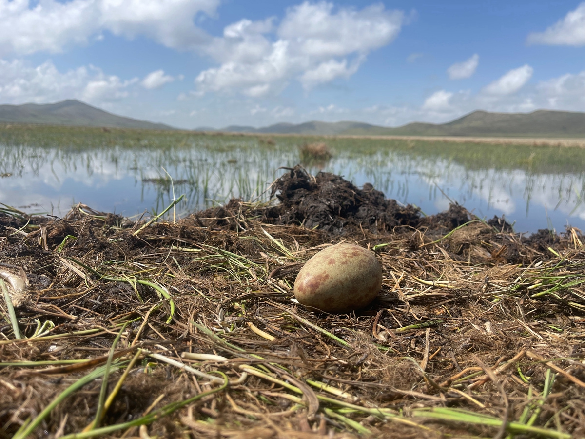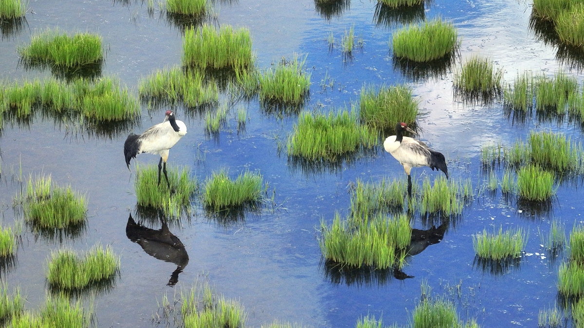 今年3月中旬,首批在云貴高原越冬的黑頸鶴來到若爾蓋濕地國家級自然保護(hù)區(qū),在保護(hù)區(qū)進(jìn)行新一輪適應(yīng)和筑巢后,迎來了繁育期。這對正在產(chǎn)卵的黑頸鶴夫婦是當(dāng)?shù)氐摹袄吓笥选?,今年已是它們在此連續(xù)繁育的第五個年頭。