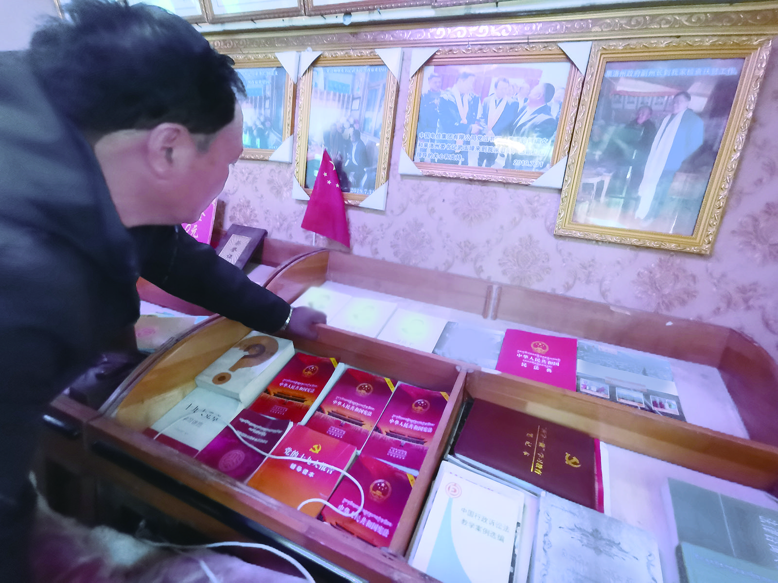 “十戶長”葉哈特家中設(shè)有一個圖書角,政策、法律、民族團結(jié)等方面的書籍都有,牧民們隨時都可以來家里閱覽。