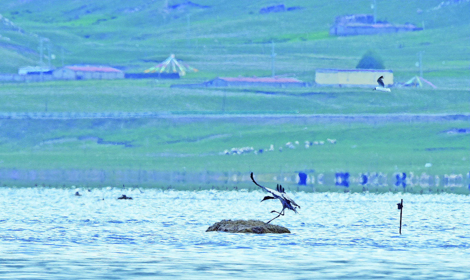 多杰措毛是泉灣保護站的一名生態(tài)管護員,在泉灣濕地尕日拉區(qū)域內(nèi),用望遠鏡觀察湖面上一對正在孵育幼鳥的黑頸鶴,她回憶起今年跟著當?shù)丨h(huán)保人士給黑頸鶴筑巢修巢的場景。