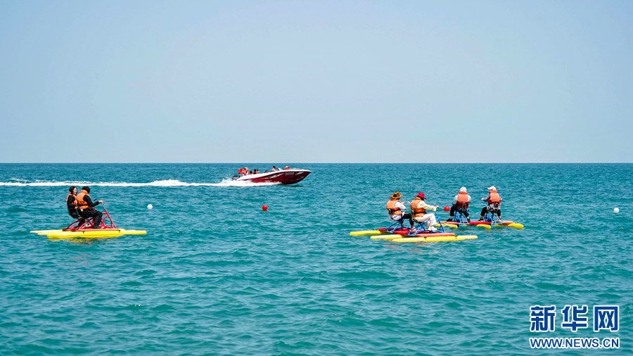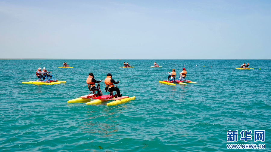 游客在青海湖青海湖景區(qū)體驗(yàn)游樂項(xiàng)目。新華網(wǎng) 宋忠勇 攝